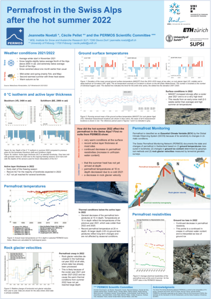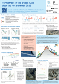 The ground temperatures in the uppermost meters of the permafrost are above average and new records of active layer thickness were measured at many sites. Correspondingly, the permafrost resistivity decreased in summer 2022. However, further down at ca. 10 m depth, the permafrost conditions are still influenced by the colder year 2021 and ground temperatures decreased compared to the previous years. Correspondingly, rock glacier velocity decreased in 2022.